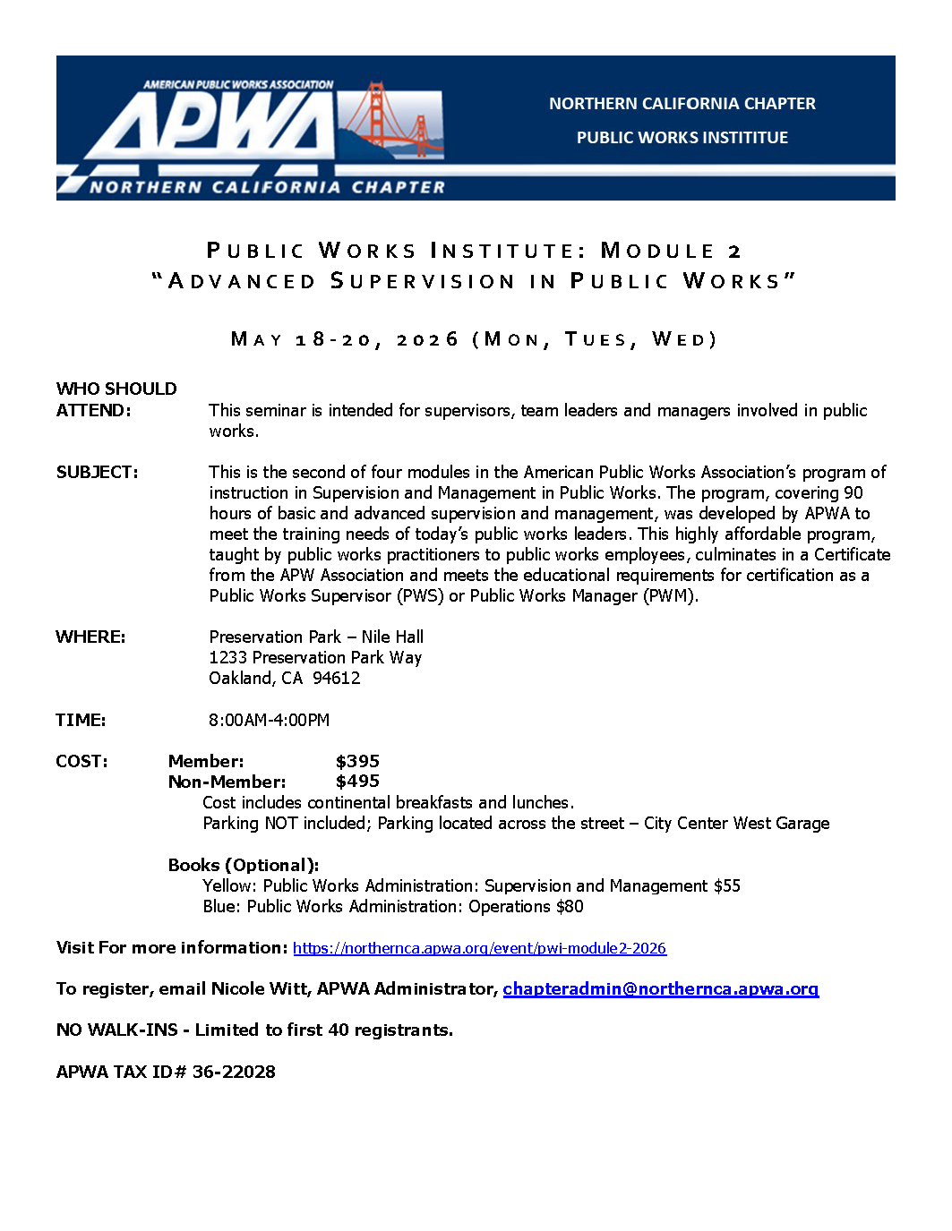 Registration Opens – April 1, 2026 Venue , CaliforniaUnited States Related Events March 31, 2026 APWA Facilities and Grounds Management Certific... Register Today April 9, 2026 APWA Managing Speeds in All Contexts: Best Prac... Register Today April 16, 2026 Young Professionals Networking with Richmond De... Register Today